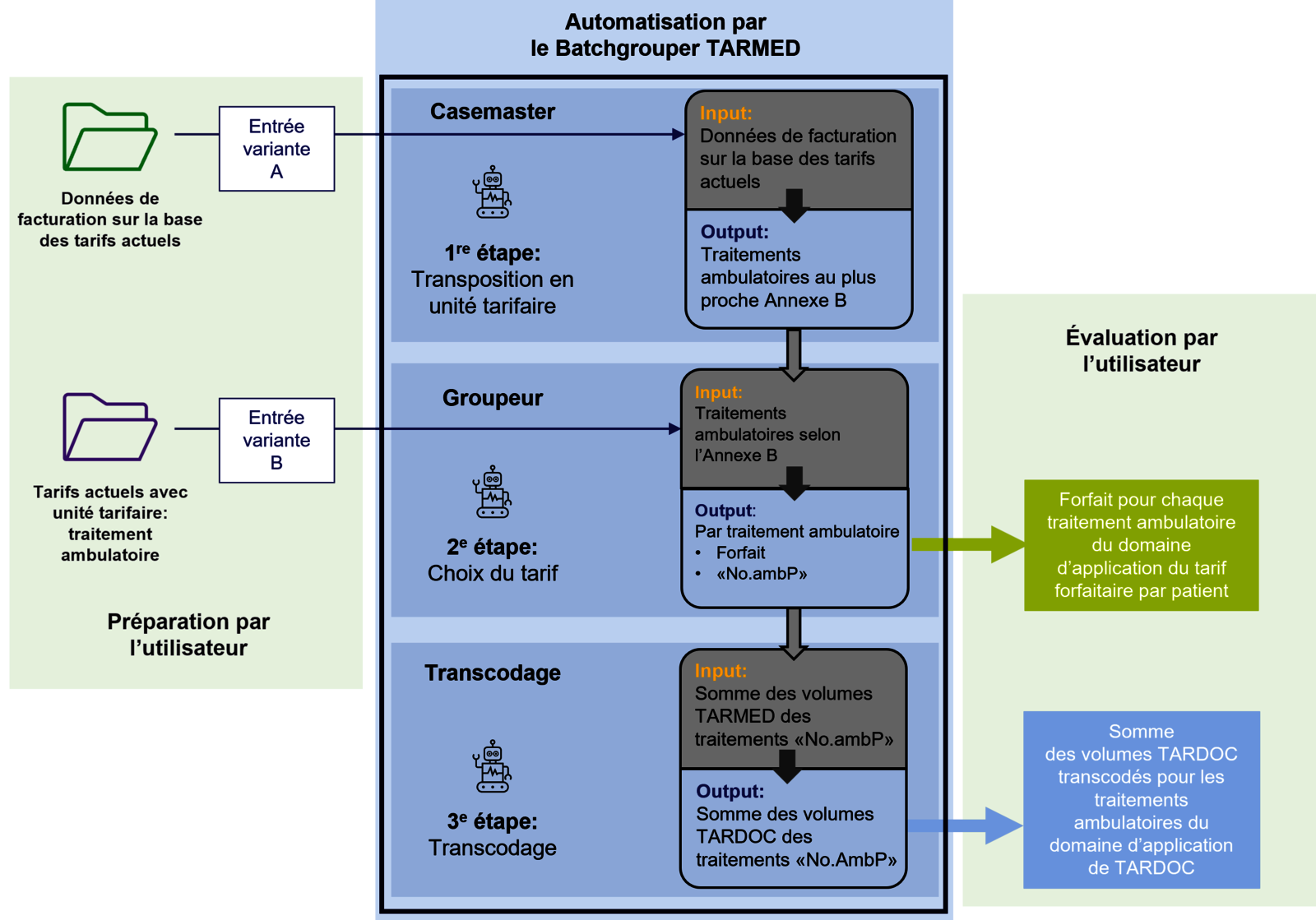Description des fonctions: le Batchgrouper permet de simuler les données de facturation avec les tarifs actuels dans le système tarifaire global. Le Batchgrouper sert à la simulation des traitements aussi bien selon TARDOC que selon les forfaits ambulatoires. Le Batchgrouper effectue automatiquement les fonctions suivantes: