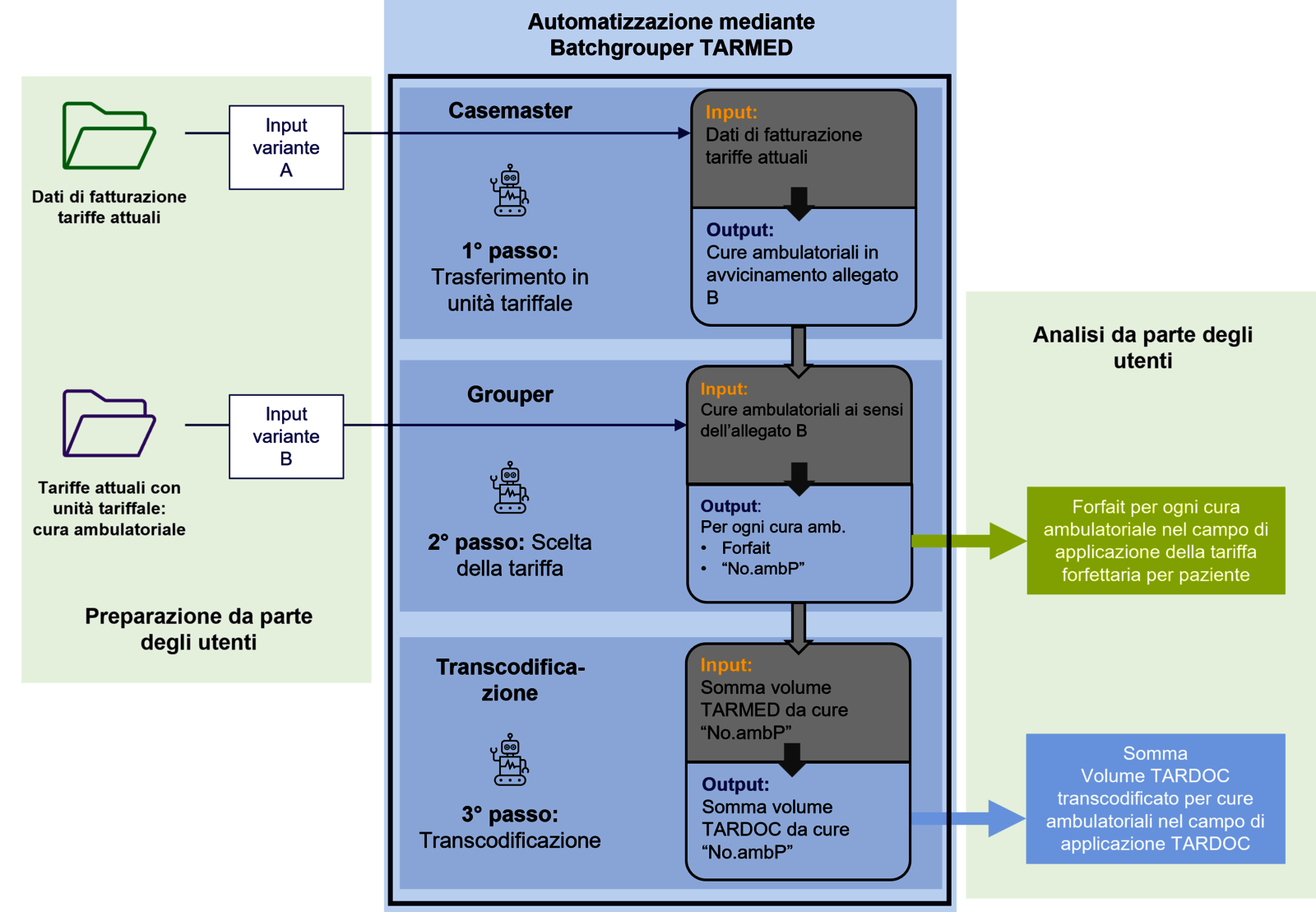 - 3°passo Transcodificazione: Trasposizione delle posizioni tariffali TARMED in posizioni tariffali TARDOC Tale passo è necessario se la cura ambulatoriale non è raggruppata in un forfait ambulatoriale e occorre transcodificare le posizioni tariffali TARMED in posizioni tariffali TARDOC.