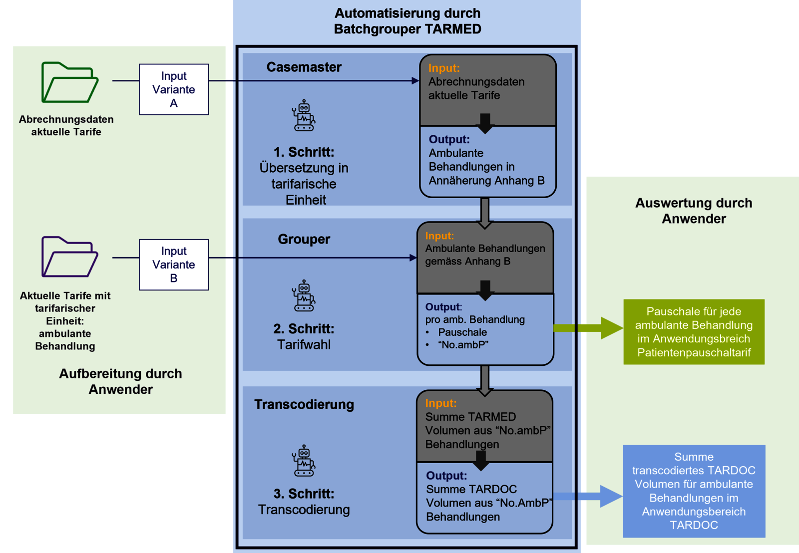 - Schritt Transcodierung (optional): TARMED-Tarifpositionen aus der Kategorie «NO.ambP» (nicht im Anwendungsbereich der Ambulanten Pauschalen) können durch den Batchgrouper in TARDOC-Tarifpositionen überführt werden. Dazu wird das TARMED-Volumen der Kategorie «NO.ambP» ermittelt und statistisch in das korrespondierende TARDOC-Volumen übertragen. In diesem Schritt werden die ursprünglichen tarifarische Einheiten der ambulanten Behandlung nicht berücksichtigt, stattdessen wird nur das Gesamtvolumen betrachtet.